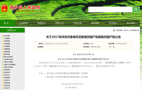 (四)以政务公开助力惠民生。推进扶贫脱贫和社会救助信息公开。围绕实施精准扶贫、精准脱贫,加大扶贫政策、扶贫对象、帮扶措施、扶贫成效、贫困退出、扶贫资金项目安排等信息公开力度。公开各镇(街道)和行政村(社区)建档立卡贫困人口和脱贫人口名单、扶贫项目实施等相关工作情况。强化困难群众救助信息公开,进一步做好城乡低保、特困人员救助供养、医疗救助、临时救助及全县灾情救助等信息公开工作,切实增强公开的针对性和有效性。