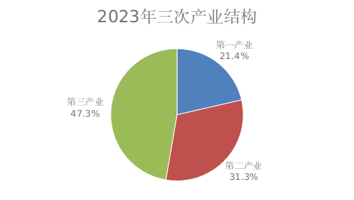 (二)经济结构更趋优化。新中国成立的75年,是西乡经济结构从以农为主到三次产业齐头并进、结构持续优化提升的75年。新中国成立到1978年,全县三次产业结构为73:17:10,全县经济以农业为主。1999年调整为37:25:38,第三产业占经济比重首次超过农业。2012年调整为28:29:43,第二产业占经济比重超过农业。2023年,全县三次产业结构为21.4:31.3:47.3,与1978年相比,第一产业占比下降51.6个百分点,第二产业占比提高14.3个百分点,第三产业占比提高37.3个百分点。