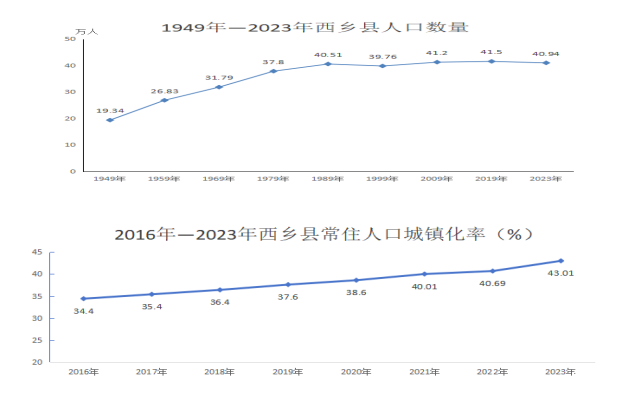 (一)城镇化建设不断提高。新中国成立75年,全县人口总量翻了一番,人口素质大幅提升,人口与经济更加协调。新中国成立以来,人口经历了快速增长到基本稳定过程。1949年全县户籍人口5.2万户、19.34万人,2023年增长到15.5万户、40.94万人,分别是1949年的3倍、2.1倍。其中,1978年已经达到7.33万户、37.42万人,1978年后到现在的45年人口仅增长9.4%,年均自然增长率2‰。城镇化率从2016年的34.4%提高到2023年的43.01%。