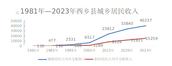 (三)群众收入大幅增加。改革开放以前,受人口激增、自然灾害频发等影响,群众生活一直挣扎在温饱线上,基本没有余钱剩米。1978-2003年,农村土地承包到户,空前调动了农民生产积极性,基本解决了温饱问题。城乡各类市场经营主体激增,收入大幅增加。2003年以来,国家取消了农业税和农业特产税,对农业生产给予全方位补助,土地流转加快,现代农业快速发展,农村劳动力进一步解放,大量富余人员涌向城镇务工,城镇人口激增,城乡经济日益繁荣,城乡居民收入同步大幅提高。2023年,全县农村居民人均可支配收入15259元,是1981年的117倍,年均增长12%。城镇居民人均可支配收入40237元,是1985年的84倍,年均增长12.4%。